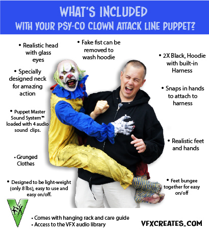 Psy-Co is an Attack Clown puppet that you wear to put the scare into your audience. A light weight, comfortable harness is fitted underneath a 2X black hoodie to disguise it in order to make wearing Psy-Co easy and eliminate fatigue so you can scare all night long. This undead clown is freakishly detailed with realistic psycho clown make up, hungry glass eyes that will chill you to the bone and of course a clown outfit that is just disturbing! Psy-Co will have your audience running for their lives or shivering in their boots!
