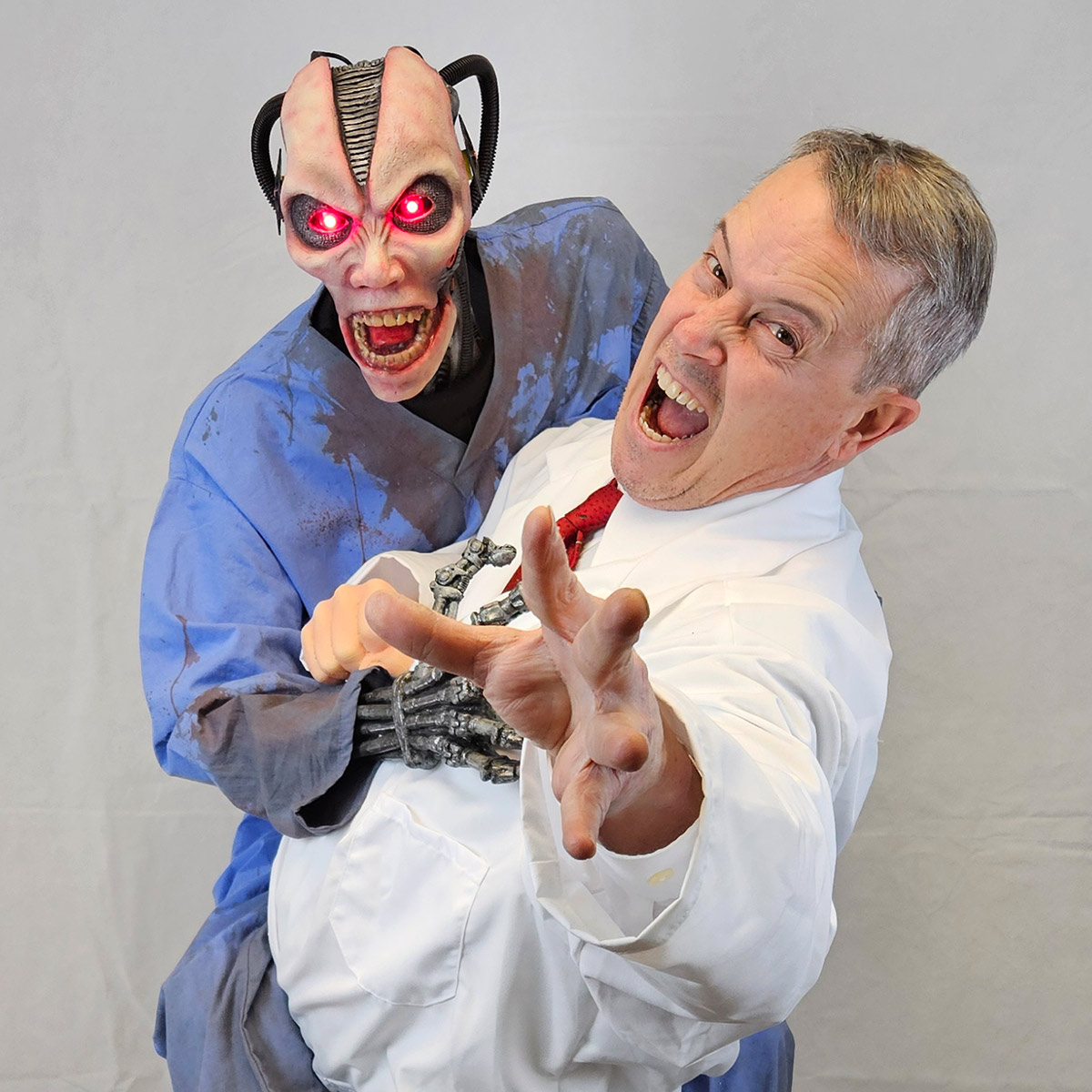 Includes lab coat with harness, fake fist and Puppet Master Sound System™.