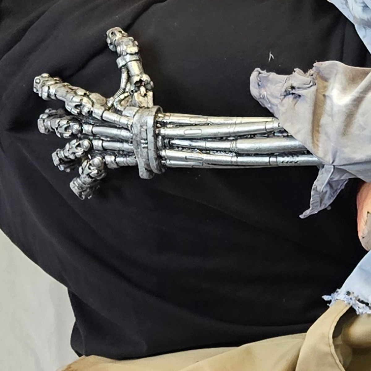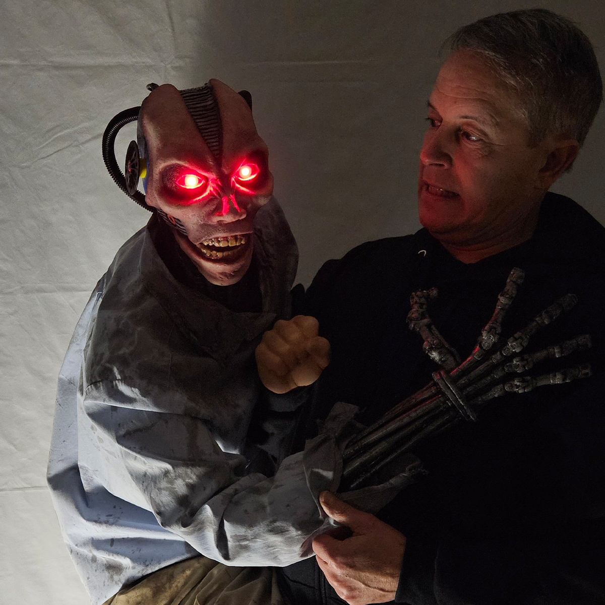 The Cyborg Sally Zombie puppet includes a Puppet Master Sound System, preloaded with audio. Note: You can download our PM software and change the audio to whatever you'd like. This puppet comes as shown in regular clothes with hoodie/harness or in lab version is dressed in scrubs and includes a lab coat/harness that the puppet's hands snap to. Her feet go around your waist and have a bungee to connect them at the ankles.
