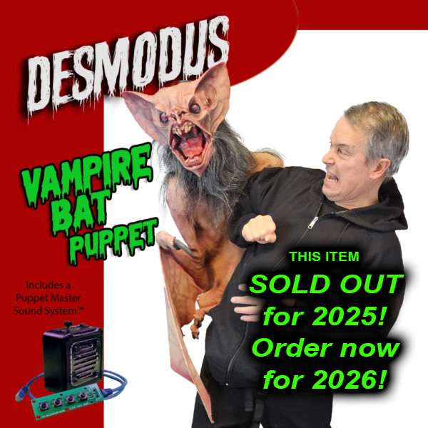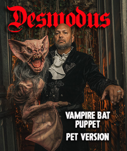 Desmodus Vampire Bat Puppet by VFX is a new, premium product for the Attack Line Puppets. Sculpted by Kent Kidwell of Mortal Remains (www.mortalremains.net), painted by Doug Schaefer (@artguy79), lead artist and designer of VFX. This bat puppet weighs around 10 pounds and has a belt strap that goes around your waste to hold his weight as he sits on your side. Your right hand goes through a hole in his chest to puppeteer his head and mouth. Includes a Puppet Master Sound System™ with creature sound effects. Note: You can change to audio on the Puppet Master to whatever you'd like.