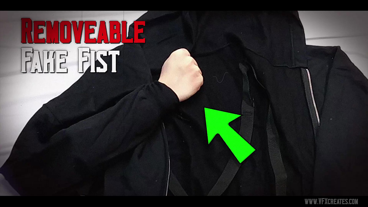 …a hoodie or lab coat, includes a fake fist to further the illusion of the creature being real.